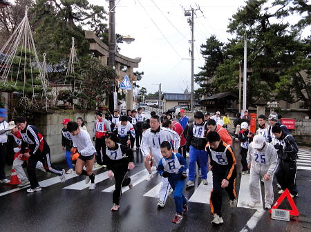 | 寺泊元旦マラソン。 白山媛神社大鳥居9:00発。 予報に反し神社側から時折、日差しが差し込む絶好の日和。 32人の参加者はお祓い、記念写真のあと3キロ、5キロの走りぞめにスタート。 皆さんマイペースで1年の健康を願う。 |