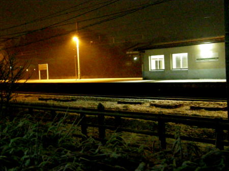 夕刻、雪はやみ寺泊駅の街灯は白く染まったホームを 薄くオレンジ色に照らしていた。 |