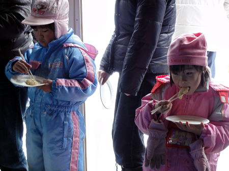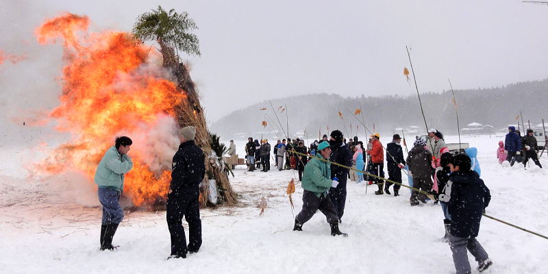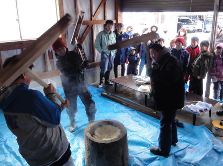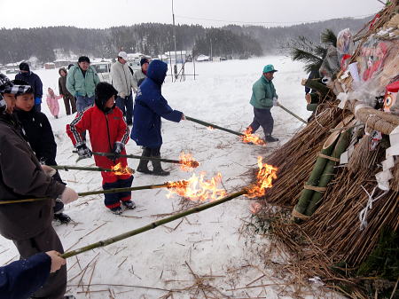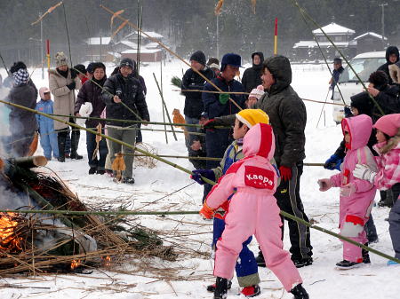 | さいの神 (年友) 1/16 昨年からはじめた「餅つき」。6年生から5,4,3年生とつき仕上げはお父さんそしてお母さんが 丸めアンコ、キナコ、ダイコンおろしで皆でいただく。 私もいただく、つきたては格別美味しかった。 陽が差していたと思ったら吹雪、さいの神の火はアッとゆうまに広がり崩れ、まってましたと子供たちが スルメを焼き、無病息災を願う。 |