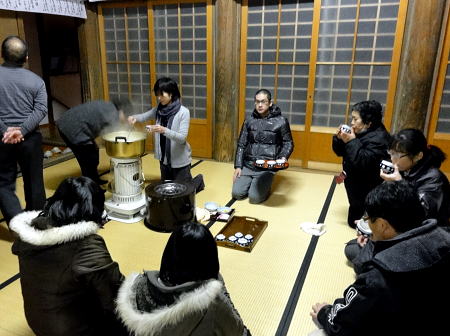 我が家の菩提寺である聖徳寺さんの本堂でお参りを して、甘酒をいただいた。 |