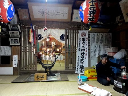 | 十二神社につくころ一段と風は強くなった。 参拝してお神酒をいただく。また赤坂山でお世話になります。 |