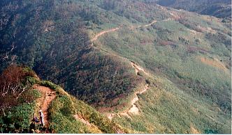 ここから苗場山への山道が良く見える,150m位かなり急な登りになるのがわかる。
